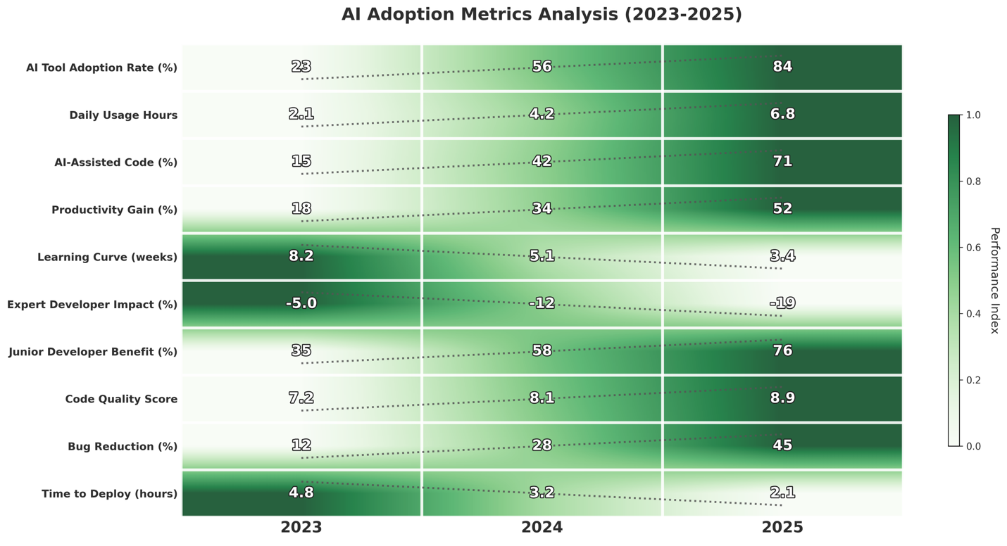 Research insight: The productivity gains from AI are real but unevenly distributed. Studies show that experienced developers tend to see substantial productivity improvements, while less experienced developers may initially struggle with over-reliance and insufficient verification skills Âł.
